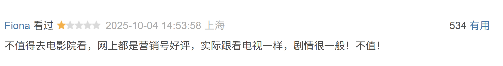 还有“不值得去电影院看,网上都是营销号好评,实际跟看电视一样,剧情很一般!不值!”