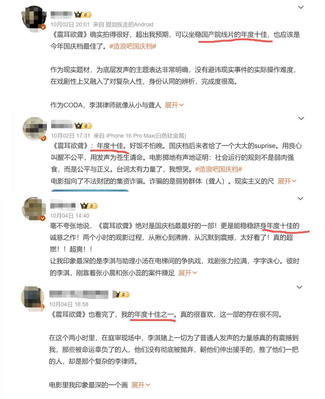 出于各种各样的理由,《震耳欲聋》的首映礼不但成功做到零差评,甚至“年度十佳”的说法就看到了几十条!几乎成了电影统一的对外宣传口号。