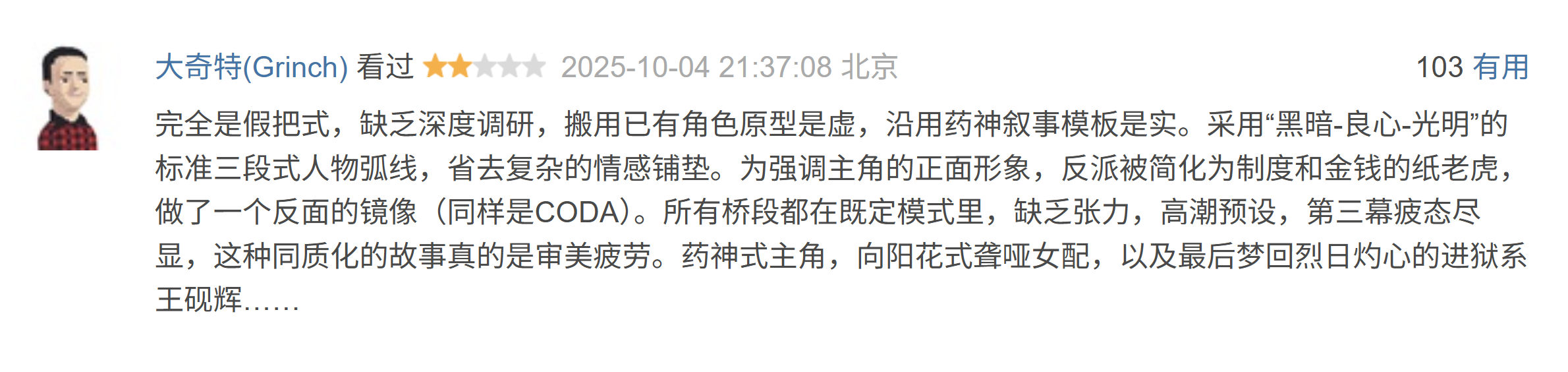 完全是假把式,缺乏深度调研,搬用已有角色原型是虚,沿用药神叙事模板是实。采用“黑暗-良心-光明”的标准三段式人物弧线,省去复杂的情感铺垫。为强调主角的正面形象,反派被简化为制度和金钱的纸老虎,做了一个反面的镜像(同样是CODA)。所有桥段都在既定模式里,缺乏张力,高潮预设,第三幕疲态尽显,这种同质化的故事真的是审美疲劳。药神式主角,向阳花式聋哑女配,以及最后梦回烈日灼心的进狱系王砚辉…