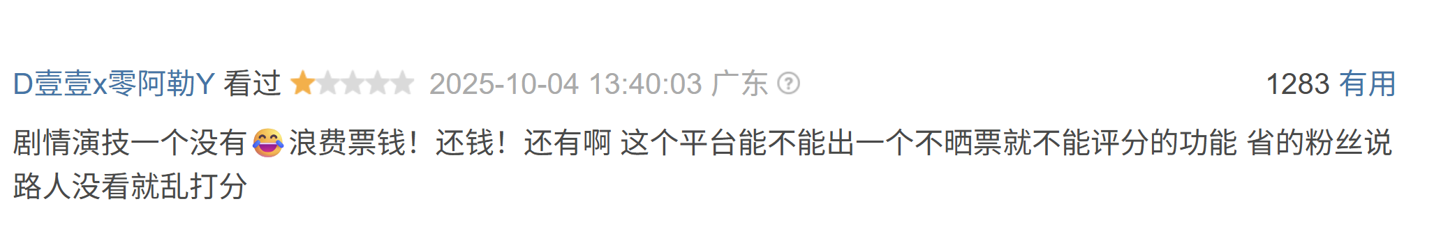 有一星观众高呼浪费票钱、还钱,并呼吁“平台能不能出一个不晒票就不能评分的功能”
