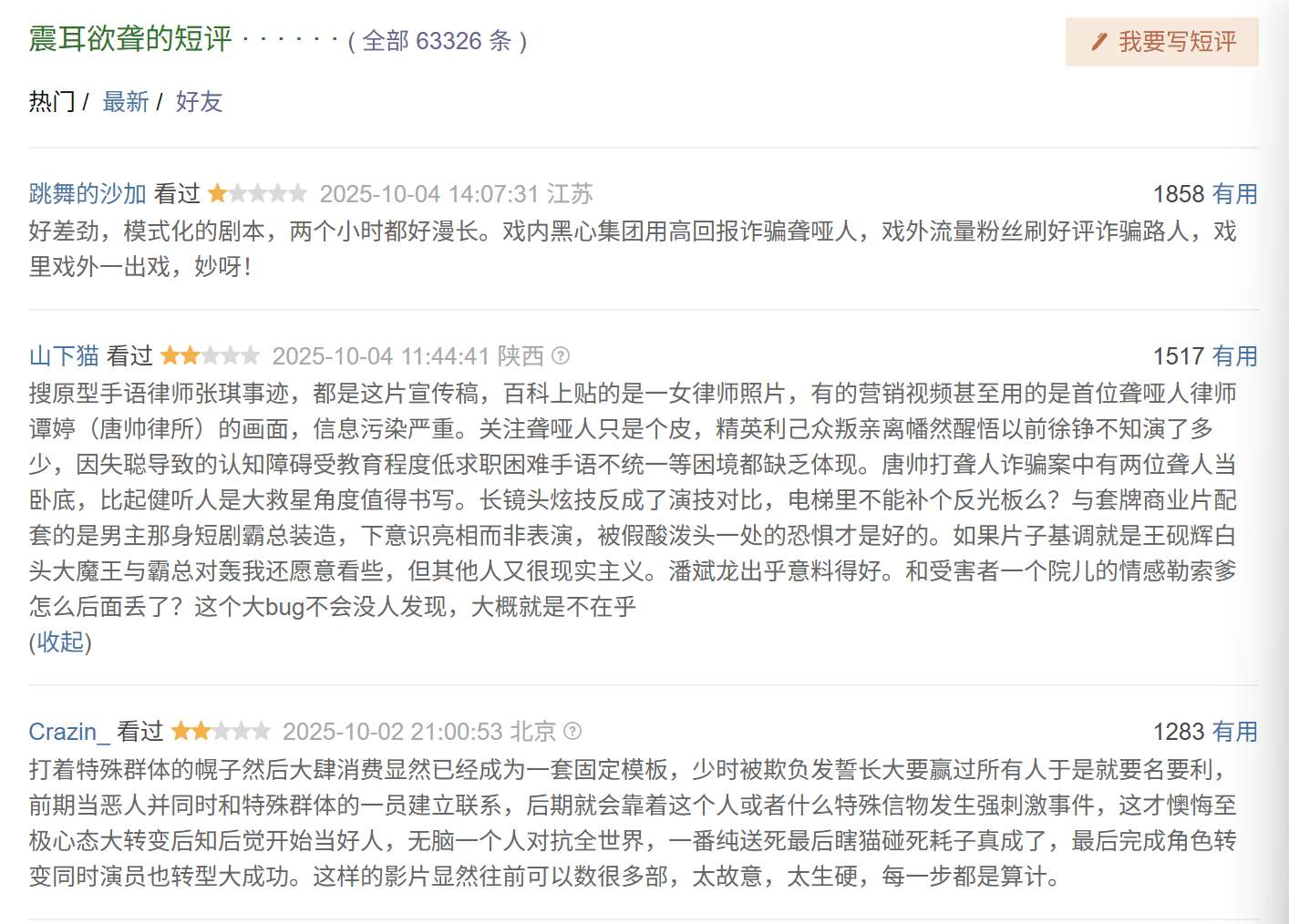 另外两条差评,也在吐槽电影“信息污染严重、关注聋哑人只是个皮,精英利己众叛亲离的戏码不知演了多少”、“打着特殊群体的幌子然后大肆消费显然已经成为一套固定模板,太故意,太生硬,每一步都是算计。”