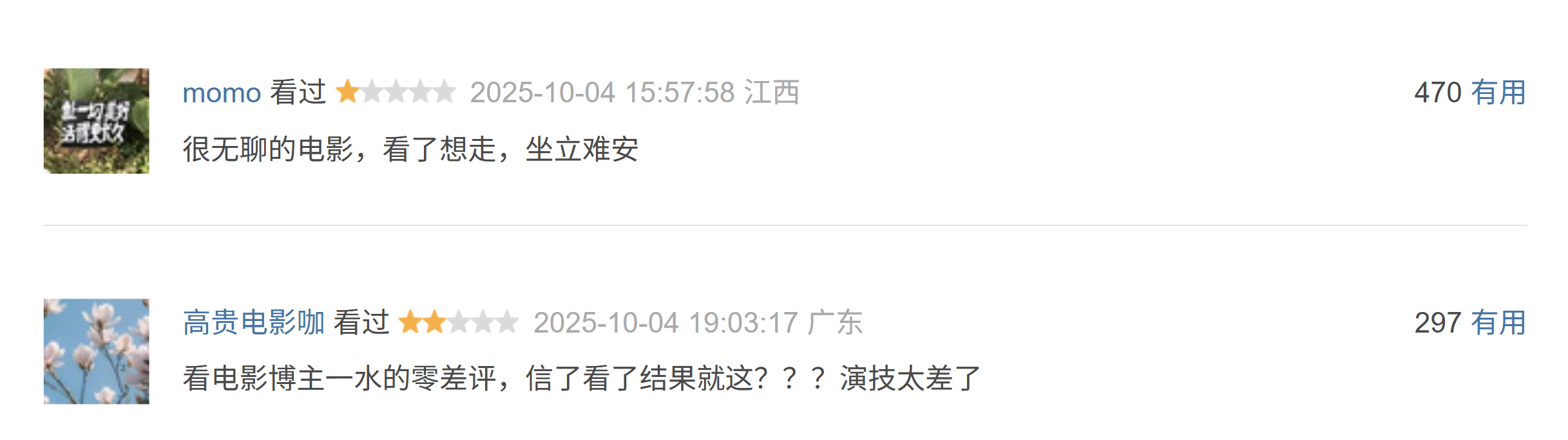 本来豆瓣是最利于此类电影口碑正向发酵的“沃土”,但电影首页随机显示的五条评论中,有三条都是差评。